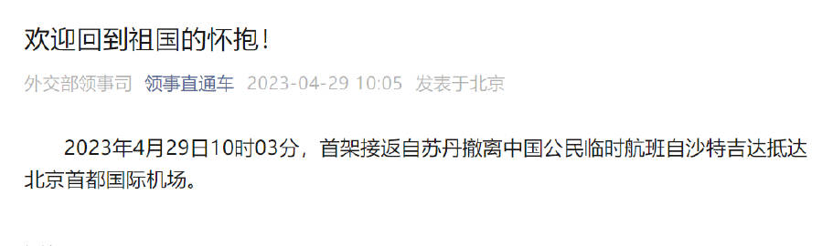 #欢迎回到祖国怀抱#【#首架接返自苏丹撤离中国公民临时航班抵京#】2023年4月29日10时03分,首架接返自苏丹撤离中国公民临时航班自沙特吉达抵达北京首都国际机场。@领事直通车